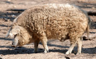 Known variously as the Mangalitsa or Mangalica, this Old World breed pig is indigenous to Hungary. Its name means “hog with a lot of lard” and is pronounced mahn-ga-leets-ah. Not only does the Mangalica pig have a lot of lard, it has a lot of curly hair which makes it resemble a sheep. The fleece can be black, or red, but is most commonly blond. The Mangalica is the last pig in existence to sport this unusual fleece, and it was nearly lost to extinction by the 1990s, when fewer than 200 pigs remained in Hungary.