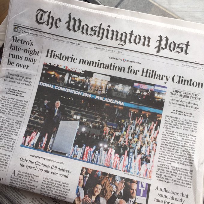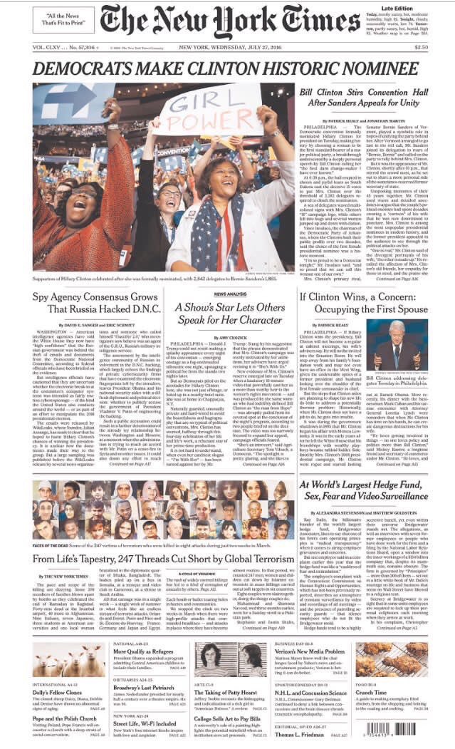 Curiously, the photos accompanying Hillary's historic headlines show, Bill, Bernie, and some random convention attendees.
